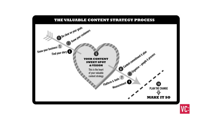 - Set out your content sweet spot and vision. Now we get to the heart of your valuable content strategy process. What is the conversation you want to own with your content? Think big here. As a business, what are you better equipped than anyone else to help people with? Uncover your sweet spot then set out an inspiring vision for your content marketing. How will you win?